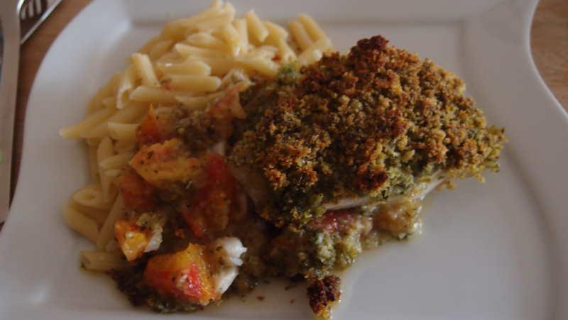 und heute seelachs mit kräuterkruste (petersilie, bärlauch) auf einem tomatenbett aus dem ofen. dazu nudeln.