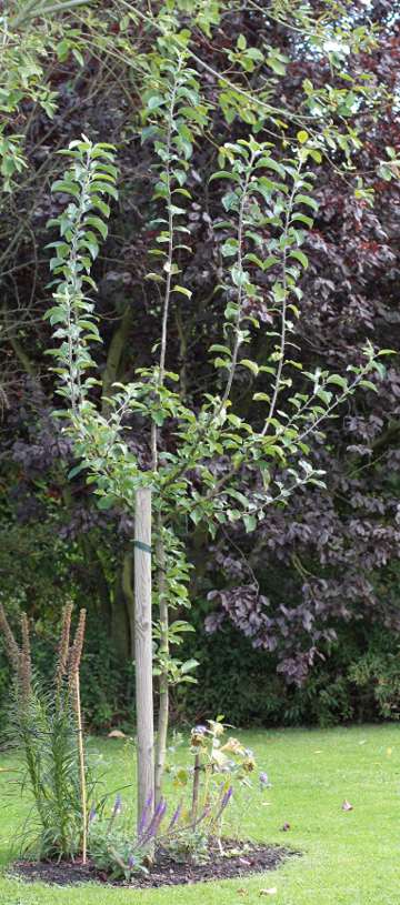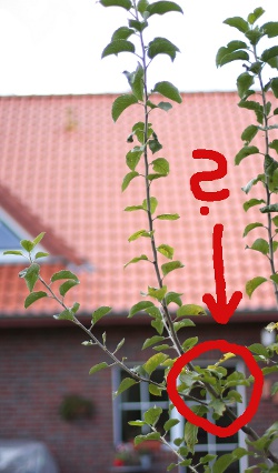 Dennoch: Ich sollte vorweg sagen, dass ich alles andere als ein Fachmann bin.Ich habe vor einigen Jahren einmal probiert, einen "Freiherr von Berlepsch" auf einen selbst gezogenen Apfelsämling zu okulieren. Es hat tatsächlich geklappt! Der Baum hat sich gut entwickelt, er hat jetzt etwa 2,5 m - 3,0 m Höhe (bis zur höchsten Triebspitze gemessen). Ich habe in den vergangenen Jahren so geschnitten, dass ein Leittrieb und 4 Seitentriebe stehen geblieben sind und würde gerne wissen, wie ich den Baum am besten weiter erziehen kann. Was würdet ihr empfehlen? Grundsätzlich: Den Leittrieb und die Seitentriebe einkürzen? Wieviel? Und dann noch speziell die Frage, ob ich in diesem Stadium noch auf flacher stehende Äste ableiten soll (siehe das Bild, was ich gleich noch einstelle). Wenn nicht ableiten, was dann mit den flach stehenden Ästen machen? Auch einkürzen oder ganz entfernen?Danke für jeden Tipp!Viele GrüßeKarl