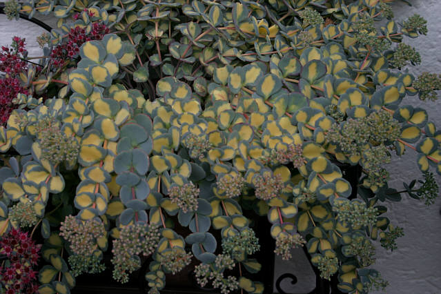 Auf dem Bild ist Sedum sieboldii 'Mediovariegatum' zu sehen. Ebenso ist gut erkennbar, dass diese Pflanze immer wieder reingrüne Triebe schiebt.ich wußte garnicht, dass es auch panaschierte Sedum gibt!
