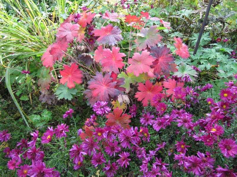 Meine wunderbare rotviolette A. domusus blüht gegen die ebenfalls wunderbare Herbstfärbung von G. wlassovianum an.