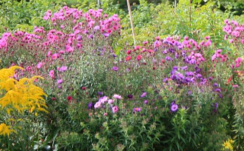 Und noch einmal einen Trost für alle, bei denen sich die novae-angliae nicht aussäen:Auf dem Bild muß man relativ genau hingucken, ist nur ein Ausschnitt mit schlechter Bildqualität.Was man nicht mehr sieht: hier ist eigentlich eine Kletterrose.Letztes jahr wurde ein kleiner Asternsämling in rosa stehengelassen. In diesem Jahr sieht man, was sich alles an Farben in der rosa Aster wiederum ausgesät hat: von ganz dunkelviolett bis ganz hellrosa.Eine Plage.Die sind jetzt übrigens nicht mehr, bis auf die "schwarze" glaube ich, die haben wir soweit ich moich erinnere, woanders untergemogelt...