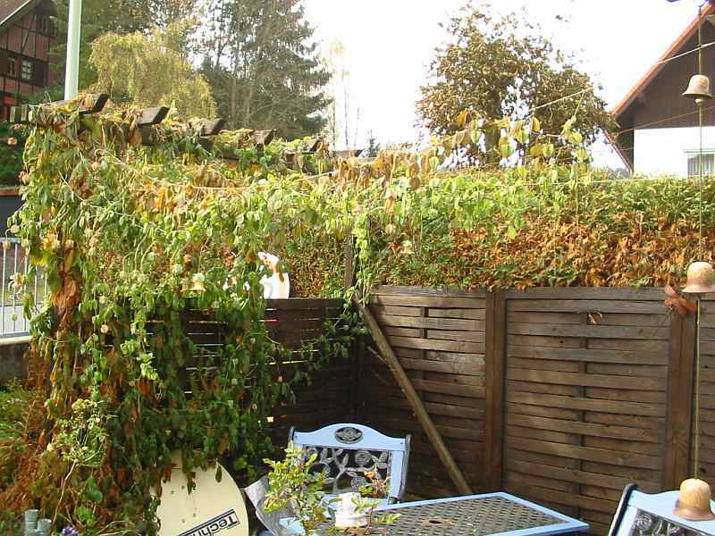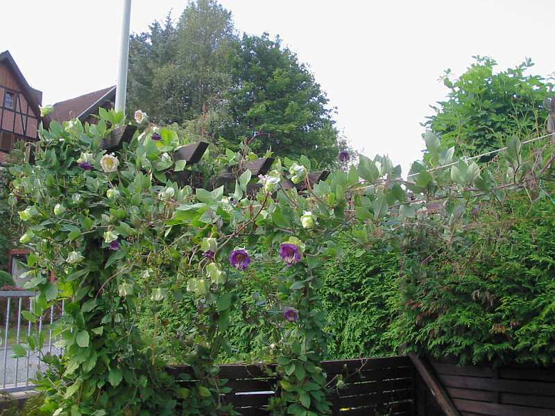 Habe gestern eine große Überraschung erlebt.Meine auf dem Balkon gepflanzten Glockenreben haben ohne zu Blühen sehr zeitig den Abgang gemacht. Gestern habe icch den Wohnwagen im Wakd winterfest gemacht. Dort habe ich die überzähligen GR in einen Kübel (40X40 cm) gepflanzt und unter eine Eiche gestellt. Sie sind munter dran hoch geklettert. Bestimmt 12 Meter. In luftigen Höhe ( ca. 10 m) blühte blau und weiss nebeneinander.Wahrscheiöich hätte ich die Rebe beizeiten kürzen müssen um mehr Blüten in Sichtweite zu haben.LG Galeo