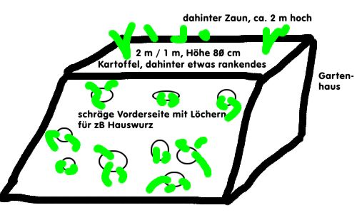 Hallo!Ich bin grad dabei mir ein Hochbeet zu bauen (siehe Skizze) und habe dazu einige Fragen, da das alles völlig neu ist für mich.1. Mein wohl größtes Problem ist derzeit, wie ich günstig an Füllmaterial komme. Äste, Häckselmaterial, Kompost .... das habe ich alles nicht selbst, kenne auch niemanden, der da was für mich hätte. Hat jemand Tipps für mich?Am liebsten würde ich das Hochbeet wir folgt bepflanzen: Oben Kartoffel, oben in der hintersten Reihe irgendwas hochwachsendes, rankendes, ich weiß noch nicht was und auf der schrägen Vorderseite dachte ich mir, dass ich Löcher bohre und dort meine SempervivenSammlung unterbringe.2. Sempervivum und Kartoffel - passt das überhaupt zusammen? Ich dachte mir, das könnte hübsch aussehen