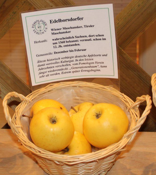 Eure Edelborsdorfer schauen so anders aus.Und überhaupt sind die Beschreibungen dazu sehr unterschiedlich. Ich habe auch einen, der allerdings seit 5 Jahren noch nicht trägt.Edelborsdorfer oder die Borsdorfer überhaupt scheinen eher so als Sortengemisch im Handel zu sein.Wo hast du den Baum her?Ich vermisse:-kleine Frucht (etwa 56 cm breit, 49 cm hoch)-rote Färbung auf der Sonnenseite-Warzen-sehr langer stiel?Edith: Streiche "cm", setze stattdessen "mm"