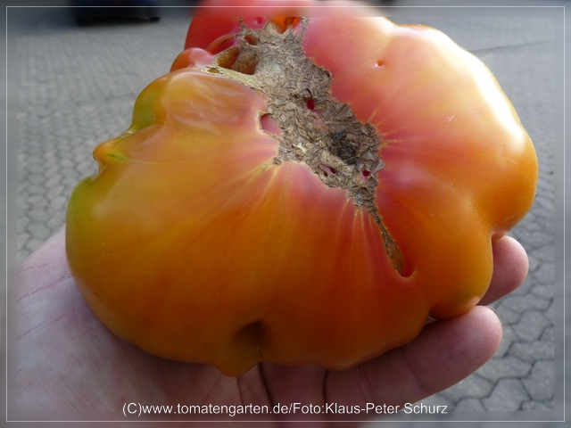 marvel striped dagegen einen richtig guten ertrag.die gezeigte frucht ist hochreif. ansich sind die fruechte erst orange und werden spaeter orange mit einem leuchtend hellroten schimmer.