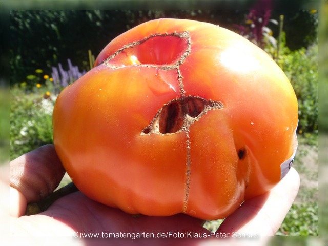 marvel striped dagegen einen richtig guten ertrag.die gezeigte frucht ist hochreif. ansich sind die fruechte erst orange und werden spaeter orange mit einem leuchtend hellroten schimmer.