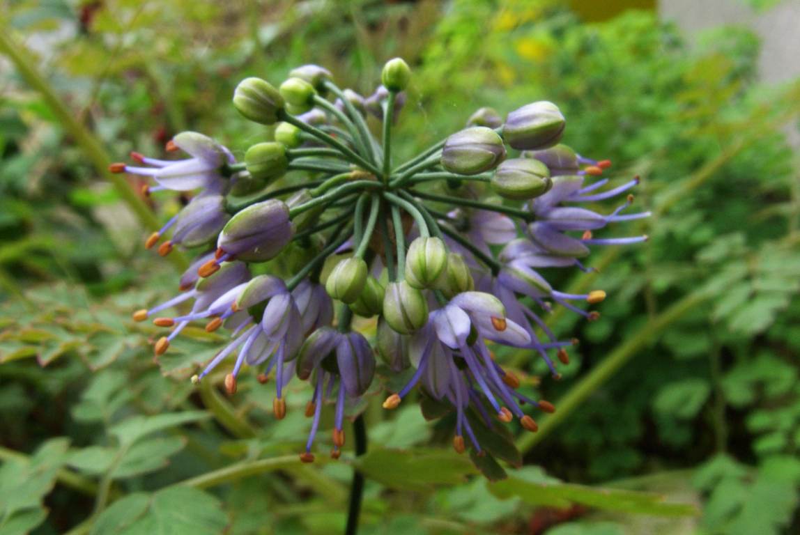 Eine der hübschesten Lauchminiaturen ist Allium sikkimense. Dieses ist völlig winterhart, aber sehr schneckenempfindlich. Daher habe ich von gekauften drei Pflanzen nur noch dieses eine übrig, welches aber nach Standortwechsel in den Halbschatten gut zur Blüte gekommen ist, hier vor dem Hintergrund eines sich gerade entwickelten Corydalis ophiocarpa (nur in diesem Stadium sieht dieser zweijährige Lerchensporn gut aus!). Das Köpfchen ist nur 2 cm im Durchmesser, aber die violett-blauen Blüten mit ihren orangefarbenen Staubgefässen wirken wunderschön. Eines meiner Lieblinge!