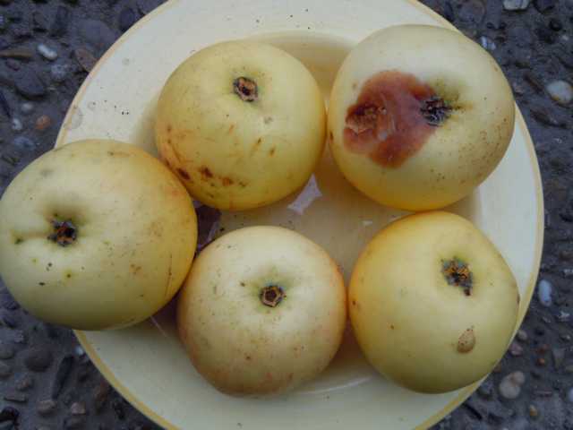 Bei diesem Apfel hab ich ein Bestimmungsproblem.Der Baum steht auf der Flur, in schwerem Boden. Ist etwa 20 Jahre alt. Wurde von einem Sachkundigen gepflanzt, zumindest traue ich ihm es zu. Sorte leider nicht mehr bekannt.Da ich "weiße" Äpfel (z.b. Landsberger) oft gerne mag, hab ich mal ein paar aufgehoben. Das war vor 14 Tagen.Die Äpfel duften stark und süß.Nach 14 Tagen im Treppenhaus sind die Früchte fettig.Geschmack ist herrlich fest, saftig und aromatisch, säuerlich, aber nicht zuviel.Vielleicht kennt sie ja jemand.