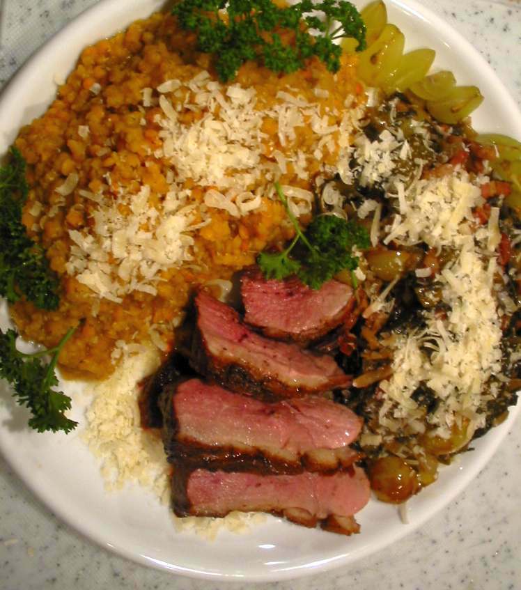 Heute abend gabs mit Speck, Gartenchili, Weintrauben und Zwiebeln geschmorte Blattzichorie (mit etwas Balsamico und Kürbiskernöl), die den Frost gut überstanden hat, rote Linsen und gebratene Entenbrust und etwas geriebener Parmesan.Die Blattzichorie konnten wir nur teilweise aufessen, die war wirklich ziemlich bitter, die, die noch im Beet steht, werd ich vorher warm wässern.Linsen und Ente wurden natürlich ratz fatz vertilgt