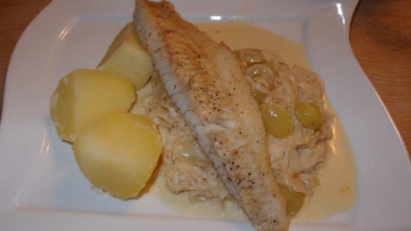 ich hab heute was neues (nach einem rezept) ausprobiert.gebratener zander, rahmsauerkraut mit trauben und dazu salzkartoffeln.ich fands ausgesprochen lecker
