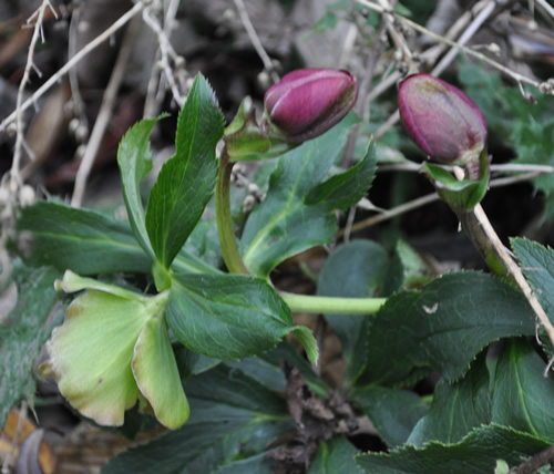 Nachdem zudeckendes "Beiwerk" verschwunden ist, zeigt sich die zweite Helleborus mit Knospen, die offenbar aber schon im Frühherbst eine Blüte gemacht hatte: