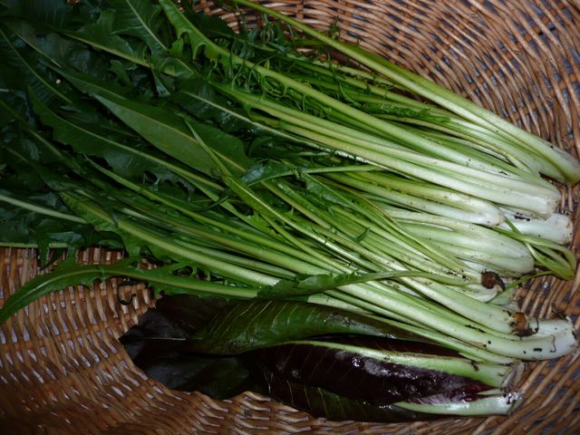 Es müßte Puntarella di Brindisina sein, der ist am wenigsten frostfest und muss daher als erster aufgegessen werden. Ein paar Blätter wild ausgesäter R. di Treviso sind auch dabei - wegen der Farbe.