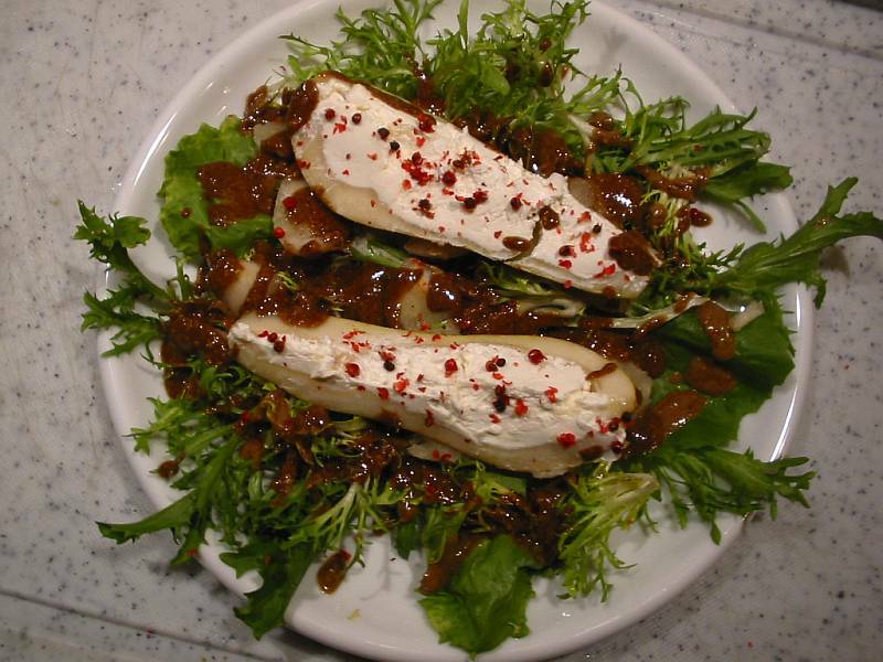 Vorher einen großen Teller mit Gartenendivie, Birne mit Ziegenkäsefüllung, Dressing und Mandelpesto und rosa Beerenpfeffer: