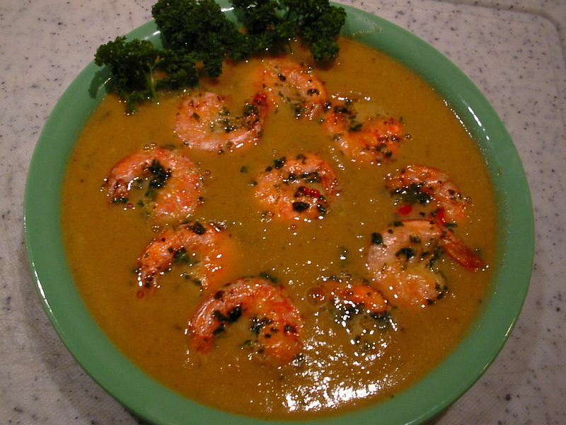 Aber eigentlich klingt das doch ganz gut, eva, sowas probier ich auch immer mal, vielleicht wars zuviel Mehl? Ich hab heute die Kartoffel-Meerettich-Suppe von gesatern püriert, Rindfleisch war alle, deshalb dazu ein paar Garnelenschwänze mit Chili, Knofi und Petersilie angebraten, den Bratrest in die Suppe und umgerührt:
