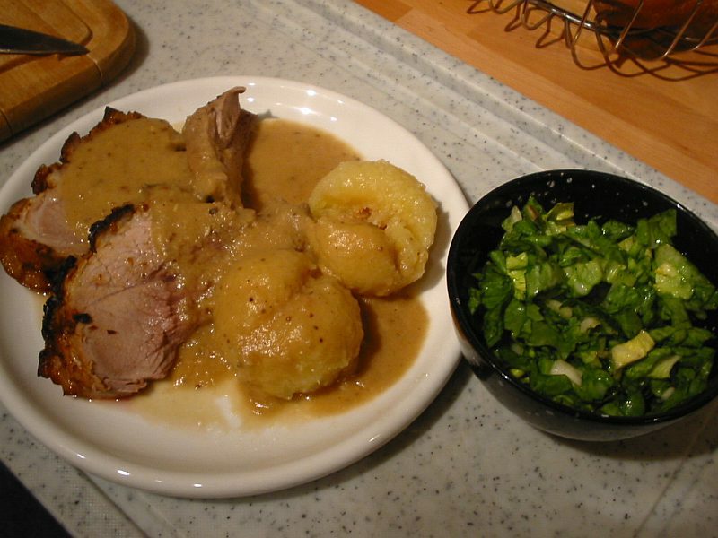 Hier gab es gerade Schweinekrustenbraten mit Karoffelklößen, Sauce und Endiviensalat mit zu flüsig geratenem Quittengelee im Dressing.