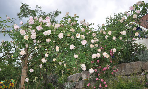Meine Bilder sind an meiner Lärche entstanden. wo die Rose bis auf 6-7 m geklettert ist und in Kaskaden herabhängt.P.S. 'Lykkefund' ist hier weitgehend immergrün.