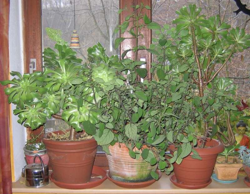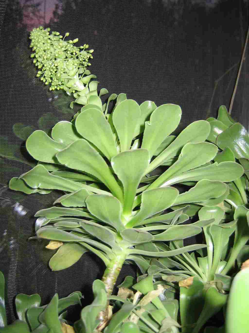 Ist es eines von denen, die höher werden und sich verzweigen? Hat es mal ein bißchen Kälte abbekommen? Das fördert auch manchmal den Blütenansatz.Hier hat es auch geklappt mit Selbstbefruchtung und Selbstaussaat von Aeonium tabuliforme.