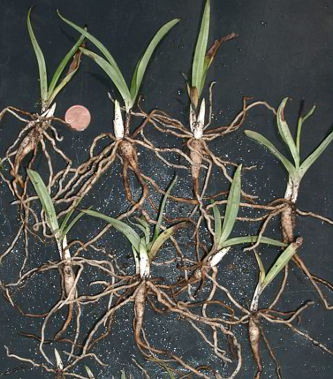 herbstzeit ist erntezeit und so habe ich mal einen meiner töpfe mit dactylorhiza sämlingen (aus dez.2003) geleert + in den garten gepflanzt. es sollten eigentlich sämlinge von dactylorhiza incarnata ssp. coccinea sein, aber nachdem 2 dieser sämlinge heuer schon geblüht hatten und nicht die rote blütenfarbe zeigten, muss ich von eine hybridisierung ausgehen. ist ja nichts ungewöhnliches bei den dactys. die sämlinge sehen kräftig aus mit gesunden wurzeln, zum teil haben sie neben einer starken triebknospe noch eine 2. kleinere gemacht. substrat im topf bestand zum ganz überwiegenden teil aus perlit mit etwas humoser gartenerde. gedüngt nur durch gelegentliches besprühen mit wuxal (1-2%).