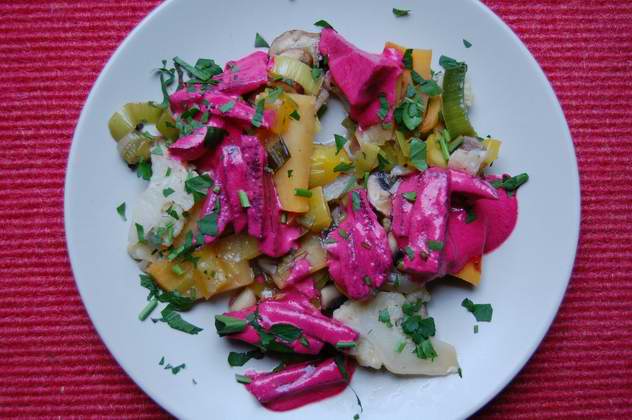 Geh ich am Besten gleich in den Keller zum leckeren Lammragout!Hier gabs gemischtes Gemüse aus dem Backofen: Süßkartoffeln, Fenchel, Zwiebel, Möhrchen, Pastiniake, Rosinen. Dazu einen gemischten Salat aus Kopf- Radiccio- und Feldsalat mit Walnüssen.Bis auf Rosinen und Süßkartoffel alles aus dem Garten.