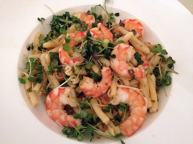 bei mir gab es eben pasta-crossover: casarecchi mit chili-zwiebel-tomate-petersilie-zitrone-olivenöl, tigergarnelen und radieschensprossen