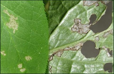 Hallo!Hier habe ich die Fotos dazu.Die Abbildung links zeigt die erste Schädigung. Später sieht es dann wie am rechten Foto aus. Natürlich glaubt man dann, es wären Schnecken, sind es aber nicht.