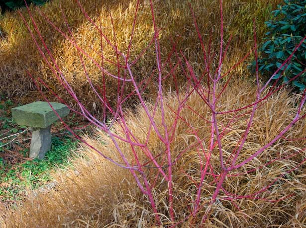Ich sehe das ähnlich wie Conni. Entweder Du machst ein Hochformat und beschränkst Dich auf Gräser und Cornus oder vielleicht ginge es ja von der anderen Seite (ich weiß ja nicht, was dort ist, wo Du gestanden hast) auch quer. Das Steindingens ist jedenfalls zu interessant, um einfach nur so im Bild zu sein - es muss also entweder Thema werden oder rausfallen.