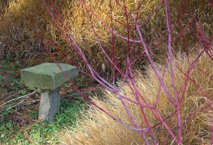 Ich sehe das ähnlich wie Conni. Entweder Du machst ein Hochformat und beschränkst Dich auf Gräser und Cornus oder vielleicht ginge es ja von der anderen Seite (ich weiß ja nicht, was dort ist, wo Du gestanden hast) auch quer. Das Steindingens ist jedenfalls zu interessant, um einfach nur so im Bild zu sein - es muss also entweder Thema werden oder rausfallen.