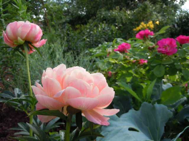 Paeonia "Coral Charme" vor Rosa "Portlandica"