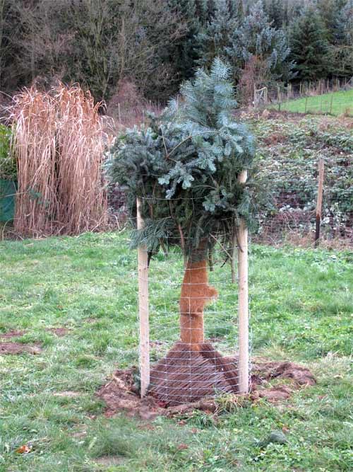 Wenn die Holzpfähle nicht so auffallen würde, könnte sie mit etwas Sternendeko als Weihnachtsbaum durchgehen. Die Idee gefällt mir. ;)Hat das Bäumchen mit dieser Art von Schutz schon Winter überlebt? Dann würde ich mich auch wieder über ein Bäumchen drüber trauen.Hier was zur Belustigung "Feige im Wintermantel"![]()