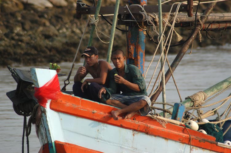 Weiter im Hafen von Chumphon, bei der morgendlichen Rückkehr der Fischer.Bei den Fotos der Menschen, die jetzt folgen, sehr hilfreich:Ein 'langes' Tele. Ich nutze ein 1:4-5,6 70-300 mm Zoomobjektiv (AF-Nikkor ED), das an meiner D 100 mit 1,5facher Verlängerung einem 105-450 mm Telezoom entspricht. - Leicht und klein genug für solche Reisen (und erschwinglich, meines habe ich gebraucht gekauft).Damit gelingen gute Aufnahmen von Menschen, ohne dass sich diese bedrängt fühlen ... meist realisieren sie nicht einmal, dass ich sie so groß fotografiere. - Ich selbst finde dies moralisch nicht bedenklich, da ich versuche, Menschen nur mit Achtung zu zeigen.BTW eine kleine Bewegungsunschärfe haben einige der Fotos - mein Schiff fährt, das andere Schiff fährt, und eine 500stel Sekunde ist dann nicht kurz genug, um diese Bewegungsunschärfe zu vermeiden.Hier: Netze flicken ...