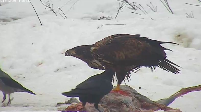 Zur Zeit sind mindestens 4 Kolkraben an den Resten des Wildes für die Adler. Vorhin waren es 6 Kolkraben.Man kann den Größenunterschied zwischen Kolkraben und Krähen gut sehen.Die Robbenkamera ist immer noch in Betrieb. Auch da waren Feiertage!Ich wünsche allen Looduskalender-Guckern ein gutes und gesundes und erfolgreiches Jahr 2013.Henriette
