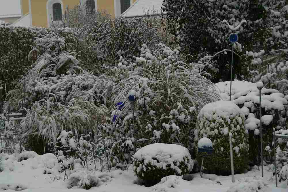 Miscanthus und hohe Astern wurden von einer dicken Nassschneedecke förmlich erdrückt. Es gibt schönere Garteneinblicke dieses Beetes....Sedum und Hydrangea Annabelle hielten sich tapfer. Zusammen mit einigen immergrünen Gehölzen und das Strauch- und Baumgerüst retten sie das winterliche Bild gerade so.