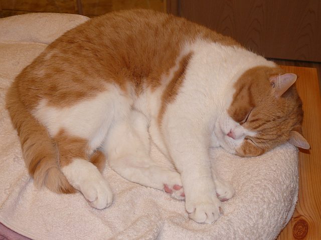 . Isaak macht sich auch gern so lang beim Kraulen, ich bin immer wieder erstaunt, wie lang so eine Katze werden kann, wenn sie sich streckt.Hier liegt Isaak allerdings eingerollt. Am niedlichsten finde ich es, wenn im Schlaf die Zungenspitze ein Stückchen aus dem Mäulchen guckt und er eine Weile träumend vor sich hinschmatzt