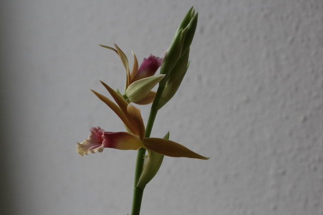 Ich hab von einem Freund eine Orchidee gekriegt, die er vor Jahren aus dem Jemen mitgebracht hat. Er erzählte mir, dass sie dort in größeren Stückzahlen auf Ruderalflächen wächst. Es ist eine Phaius-Art. Nun blüht sie bei mir im Zimmer und ich bin von ihren zarten Farben begeistert