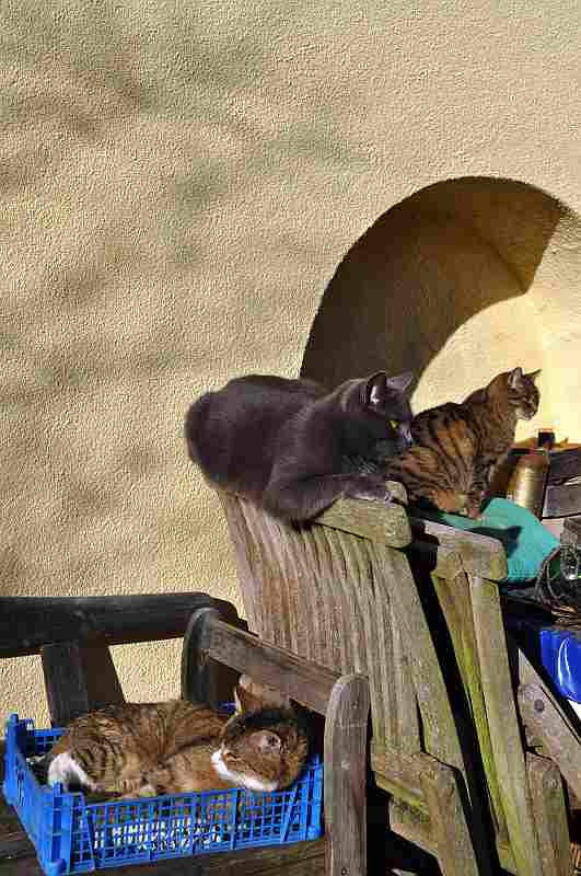 Bea, ich sehe sie alle richtig rum, auch das 1. Du hast ja viele Katzen! Und die Sonne genießen sie genauso wie wir.Gestern hatten wir Emmi noch in ein extra Zimmer gelegt, damit sie ihr Ruhe hat. Heute früh wollte sie unbedingt raus. Nach ausgiebigen beschnüffeln hat Oskar sie den ganzen Tag in Ruhe gelassen.