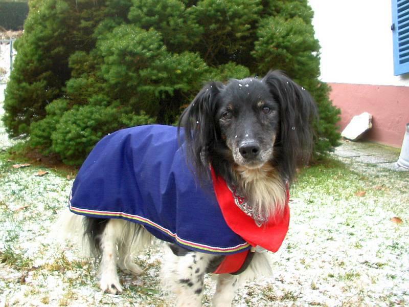 Wir haben gerade nochmal einen Gang durch den Garten gemacht, bei Schnee kommt man mit den kurzen Beinen immer so schwer durch. Eine kleine Schutzdecke trägt er mittlerweile dabei ganz gerne, bei wenig Bewegung ist das bestimmt ganz gut: