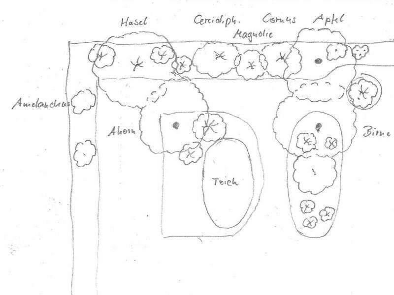 Um mein Anliegen etwas konkreter zu gestalten, zeige ich einmal eine Freihandskizze des Gartenbereichs, der als Experimentierfeld für das Projekt "Waldgarten" herhalten soll.Dies ist ein ca 15 m langer Streifen nördlich eines kleinen Gartenteichs, der bis auf eine Sonneninsel in der Mitte fast ganztägig beschattet ist. Die große Hasel und ein Eschahorn bilden ein geschlossenes Laubdach und die beiden Obstbäume lassen ganztägig nur gefiltertes Sonnenlicht durch. Dazwischen halten ein Cercidyphyllum, Magnolia 'Butterflies' und ein Cornus 'Satomi' die Mittagssonne ab. Der Bereich zwischen dem Teichbeet und dem Gehölzstreifen wird zur Zeit noch gemäht, ist jedoch so stark vermoost, dass von Rasen eigentlich keine Rede mehr sein kann.