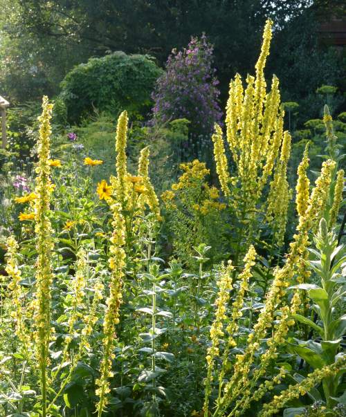 , Verbascum, Helianthus, Dill, Johanniskraut und Origanum vulgare 'Aureum'.Das Fluffige dahinter ist Spargel, der ginge auch, er wirkt sehr aufhellend, weil er lange hellgrünes Laub hat.
