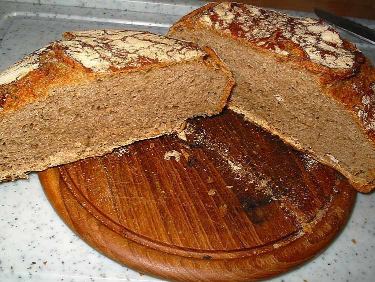 Aber es riecht köstlich und angeschnitten sieht es sehr gut aus, ich bin vor allem über die herrliche Kruste begeistert, das vermutet man beim Topfbrot eigentlich nicht, aber wohl gerade die Tatsache, dass der Wasserdampf im Topf gefangen bleibt, sorgt für die rösche Kruste, lecker!Gewürzt hab ich mit etwas fertigem Brotgewürz und eigenem, gertockneten Schabziegerklee und einer recht ordentlichen Portion Meersalz.Die Geschichte im Kaminofen war ja nur ein Experiment, ist aber erstaunlich gut gelungen, die im Netzt herumgesisternden Rezepte mal im normalen Backofen zu probieren, lohnt sicher auch, ist einfach und wirklich sehr lecker, vor allem für Krustenliebhaber