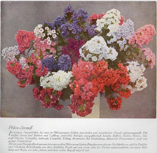 Zum Ausklang. :)Phlox-Strauß aus: "Die Gartenschönheit". - Jg. 1926"In den großen Staudenphloxen liegt eine schier überquellende Blumenfreude. Sie bilden einen der freudigsten Akkorde des sommerlichen Gartenlebens, der erst spät ausklingt. ..." (Zitat Bildunterschrift)