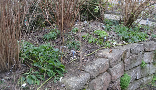 Dieser Gartenteil, hier die rechte Hälfte ist auf einer Mauer. Man kann also bestens den Hellis ins Angesicht gucken, sozusagen von Auge zu Auge! Hier waren auch die speziellen Schneeglöckchen, die stark dufteten, gleich hinter den Steinen gepflanzt. Leider hat die Katze alle rausgescharrt! >:(Im Moment liegt noch viel Laub, plus Rosenschnittholz da. Auch hier sieht es in zwei, drei Wochen ganz anders aus. Ich sagte ja, die Bilder im jetzigen Zeitpunkt, sind nicht gerade der Hammer.