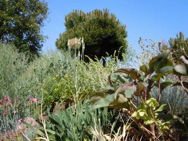 Helleborus x sternii ist eigentlich mein Favorit unter den Helleboren. Leider hat er die letzten Winter sehr gelitten und nicht geblüht.Hier mal ein Foto aus 2011, als es noch vereinzelt eine x sternii Blüte gab (Vorne rechts). Am schönsten an der Pflanze ist für mich aber eh das tolle rotgraue Laub. Auch im Standort habe ich H.x sternii entgegen meiner andern Helleboren eher "mediterran" eingesetzt.