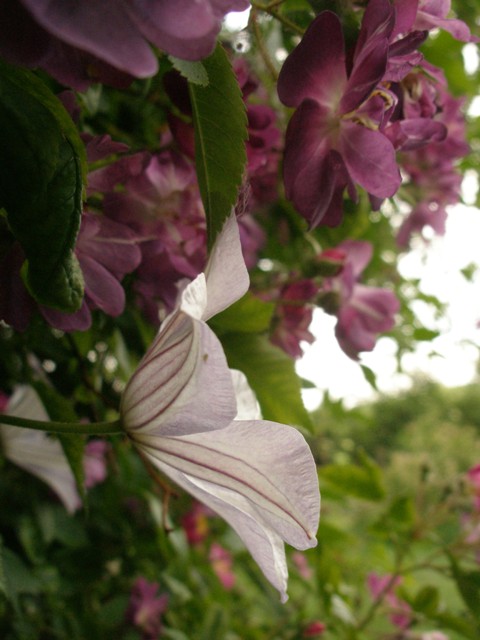 ...ich persönlich habe ein meterhohe wand zur verfügung und habe daher meiner veilchenblau noch einen bobbie james und eine clematis wilsonii dazugesellt...im vordergrund stehen dann bauernjasmin und hortensiensträucher