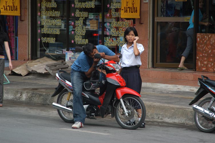 ... angekommen. Nakhon Ratchasima ist die 2tgrößte Stadt in Thailand, nicht unbedingt das, was man hübsch nennt. Aber sie ist sehr lebendig, und das liebe ich. - Was sagt dieses Mädchen ins Mobile? ... "Mama, er drückt schon wieder an den Mitessern!! Wir kommen nächsten Sonntag nicht zum Braten!" (es war Montag) ...