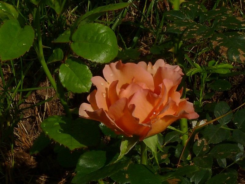 Beim Gang durch den verregneten Garten ist mir gerade 'Jean de Bohème' besonders aufgefallen. Im letzten Jahr gepflanzt, zeigte schon der erste reguläre Trieb beeindruckende Wehrorgane (leider vor der am Hang befindlichen Langzeitknödeldüngung etwas schwer zu erkennen
