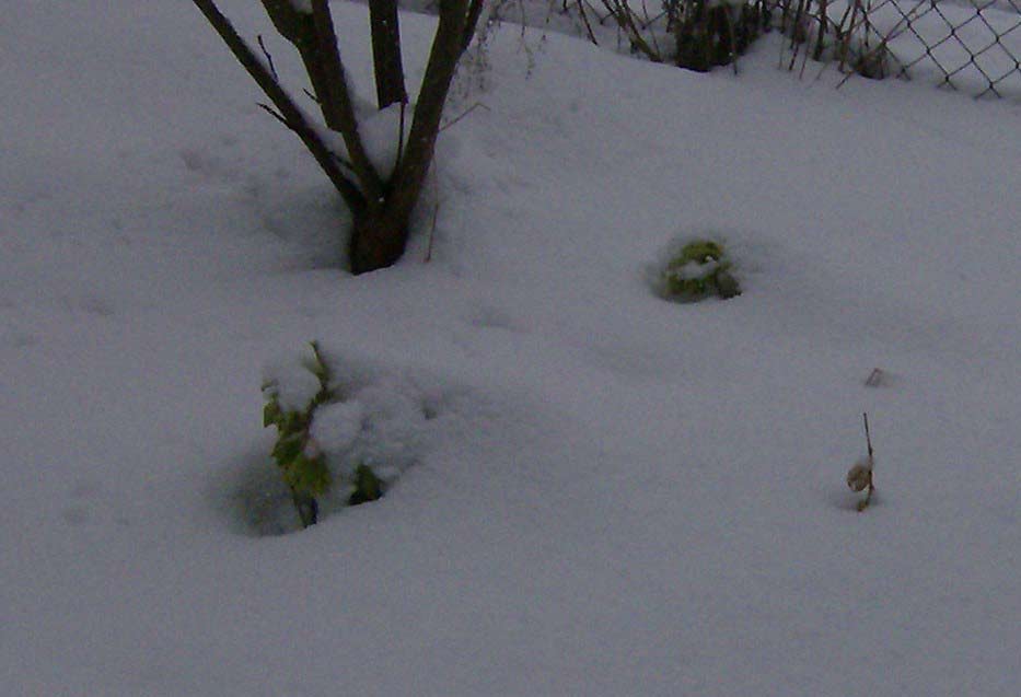 Es schneit und schneit und schneit; selbst die Helleborus foetidus verschwinden allmählich im Schnee...
