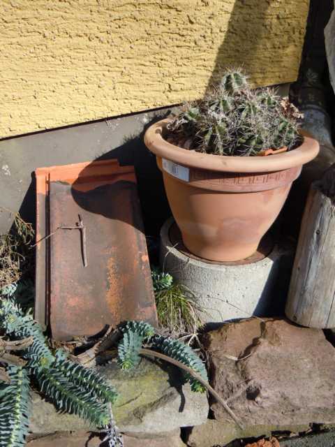 An der Haussüdseite auf dem Regenrinnensifon steht schon seit Jahren mein Kaktus. Bisher allen Wintern getrotzt.Noch sieht er schrumpelig aus, aber bald wird er wieder prall und blüht. *freu*