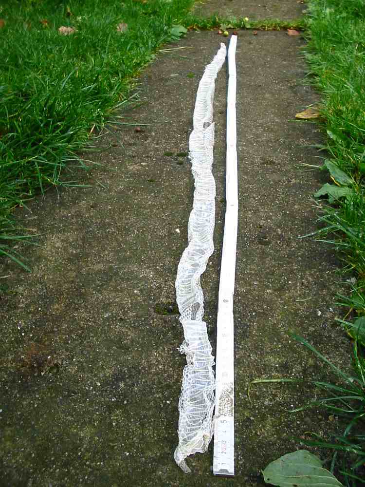 , ich hab auch erst erstaunt geguckt, dann herumgefingert und das wunderschöne Schlangenhemd gleich aufgesammelt, bevor es jemand zertritt. Ich vermute mal, dass es einer Ringelnatter gehört, vielleicht auch Schlingnatter, aber es ist sehr transparent, so dass man die Färbung nicht genau erkennen kann.Stolze 1,35m, das muss ein Weibchen gewesen sein, bestimmt wohnt sie im Krankenhausgarten (da würd ja eine Äskulapnatter fast besser passen