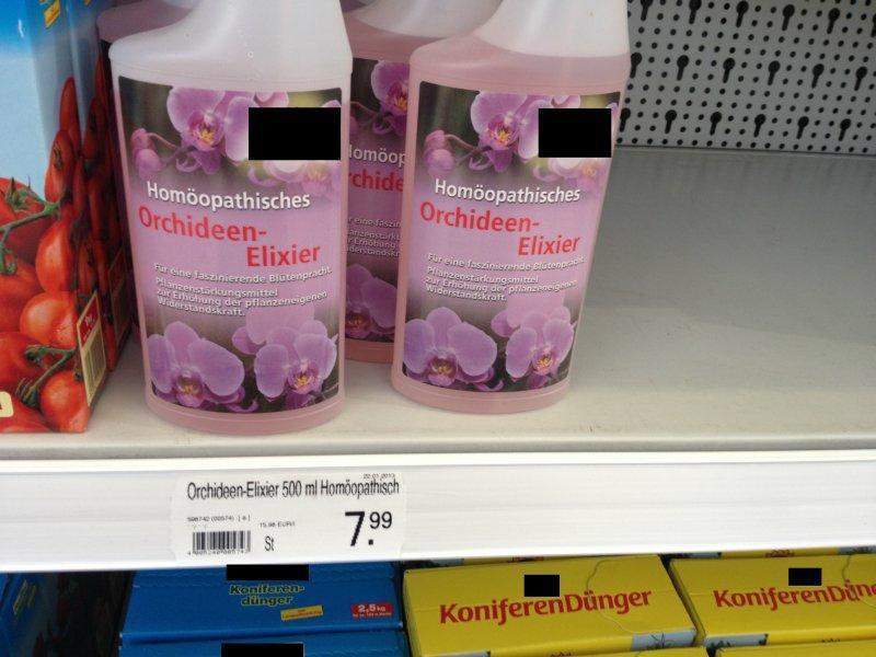 diese woche bin ich im baumarkt auf ein homöopathisches pflanzenstärkungsmittel für orchideen mit dem beliebten uralten wunderheilertitel elixier gestoßen - die inhaltsstoffe, abgesehen vom wasser, sind homöotypische minimale anteile von pflanzenauszügen, z.b. schachtelhalm.man beachte den dezenten preis für eine 500ml sprühflasche mit informiertem wasser.