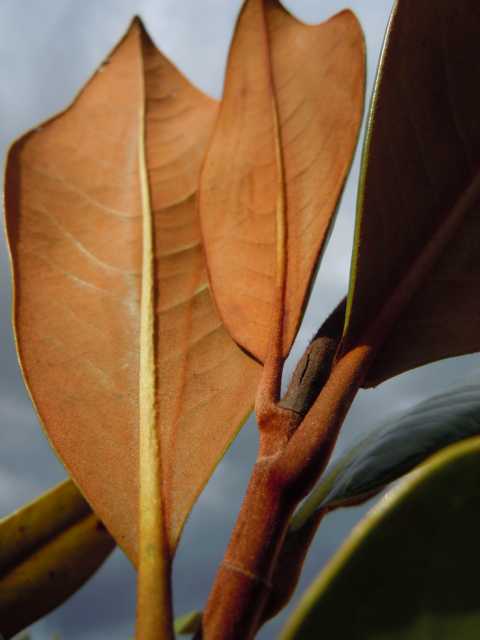 Blattunterseite von Magnolia grandiflora "Exmouth"